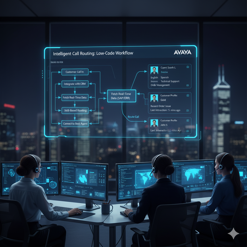 By using an Avaya low-code workflow, a business can integrate with its internal systems to pull real-time data. This allows for intelligently routing the call to the most appropriate agent who is equipped with the customer’s information. This approach simplifies the creation and management of complex workflows through a user-friendly, drag-and-drop interface, making it accessible for users of all technical levels.