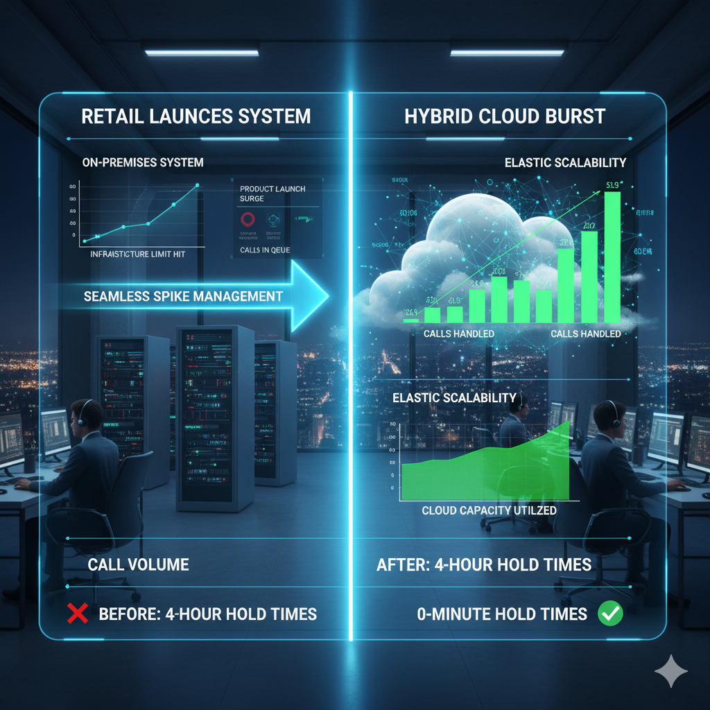We solve this by designing a hybrid cloud solution that deploys a portion of the contact center to the cloud. This allows the business to handle the surge in calls seamlessly and then scale back down when demand returns to normal. The agility of this solution ensures that the company can meet customer demand without overhauling their existing infrastructure.